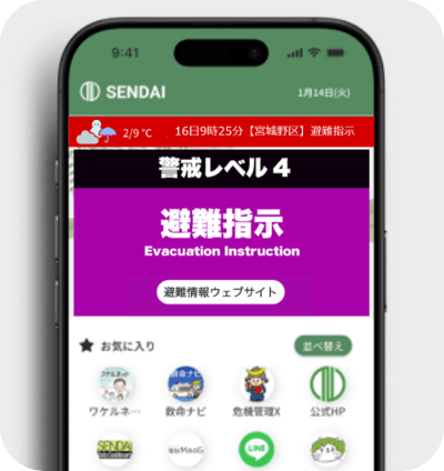 防災情報の発信気象情報や災害・避難情報などを、状況に応じて迅速に配信。仙台市の防災情報を早めにつかみ、安全な行動につなげることができます。