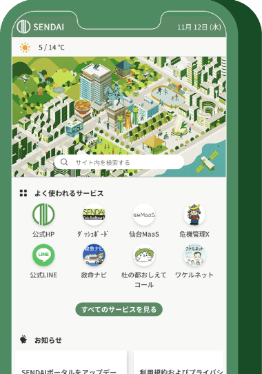 - 仙台市からのお知らせや防災情報の取得、仙台市が提供する各種サービスを確認することができます。